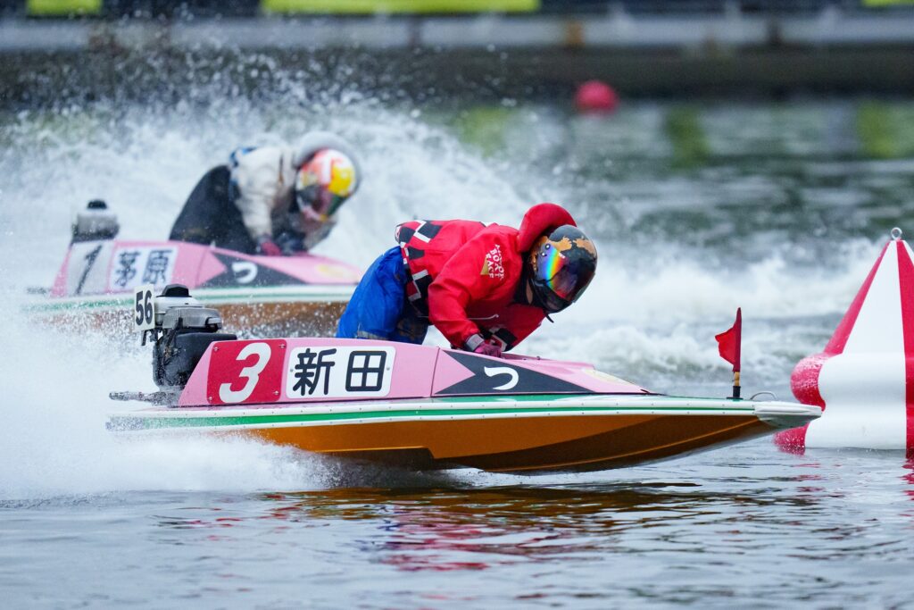 北山に一気にまくられたイン茅原悠紀はなんとか残すような旋回。ややターンマークを外しながらのターンとなり、その内を突いたのが地元の新田雄史。もちろん新田も北山にまくられていたのだが、冷静に差して茅原より前に出た。その後は茅原も猛追するものの、新田が先頭を譲らない。地元SGを準優1着で優出! 茅原が2着となった。