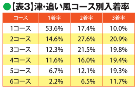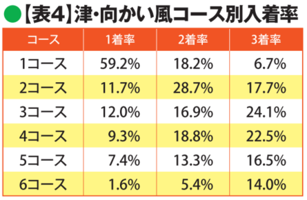 追い風時の成績は【表3】にあるとおり。追い風はイン有利ではなく、追い風時に1コース1着率が低下している。一方、向かい風【表4】では1コース1着率が上昇する。過去1年のGⅠでも同じ傾向があったので、ダービーは「追い風はイン不利、向かい風はイン有利」と覚えておこう。