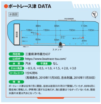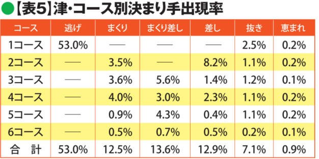 注目すべきは、まくり差しの出現率が高い点だ。攻める選手の隣、まくり差しの得意な選手はチェックしておこう。津は3コースか4コースのどちらかがまくる展開が多いので、展開予想には新概念データを役立てていただきたい。