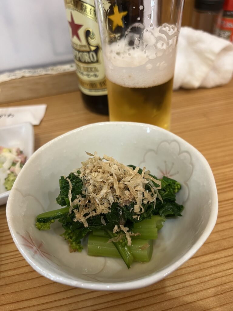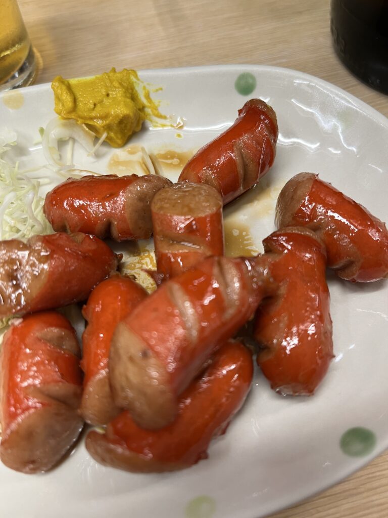 信濃路さんは前にも書いたが、立ち食いそば屋さん。入ってすぐのところにそのスペースがあり、そこから奥にズズズイッと入っていくと、居酒屋ゾーンが設けられている。何しろ朝6時30分からオープンしていて、昼酒を楽しむお客さんで午前中から混雑。今回わかったのだが、午後の夕方前くらいがむしろ狙い目のようで、今回は余裕でカウンターの一角に陣取ることができた。最近の僕はといえば、赤ウインナーがこうした大衆酒場での肴の定番。子供の頃、今のようにシャウエッセンとかはなかったから、ウインナーといえば赤ウインナーだった。郷愁を誘うっていうこともあるのか、酒呑みながら食す赤ウインナーは癒やしの味なんですよね。信濃路の赤ウインナーは味付けも好きです。