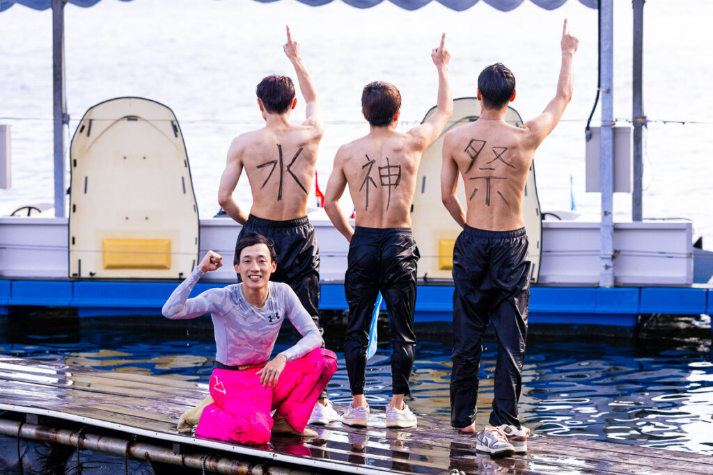 水神祭は11R発売中。埼玉勢や126期の同期、そしてなぜか末永和也、前原大道、中亮太も参加。中野を水面に放り投げたあとは、多くの選手も一緒に飛び込んで、中野とともに水中でバンザイだ。そして、末永と前原と中は上着を脱いで上半身裸になると、背中を見せて整列! すると「水」「神」「祭」と大書されていた……そういうことでしたか! ちなみに水=末永、神=中、祭=前原でした。