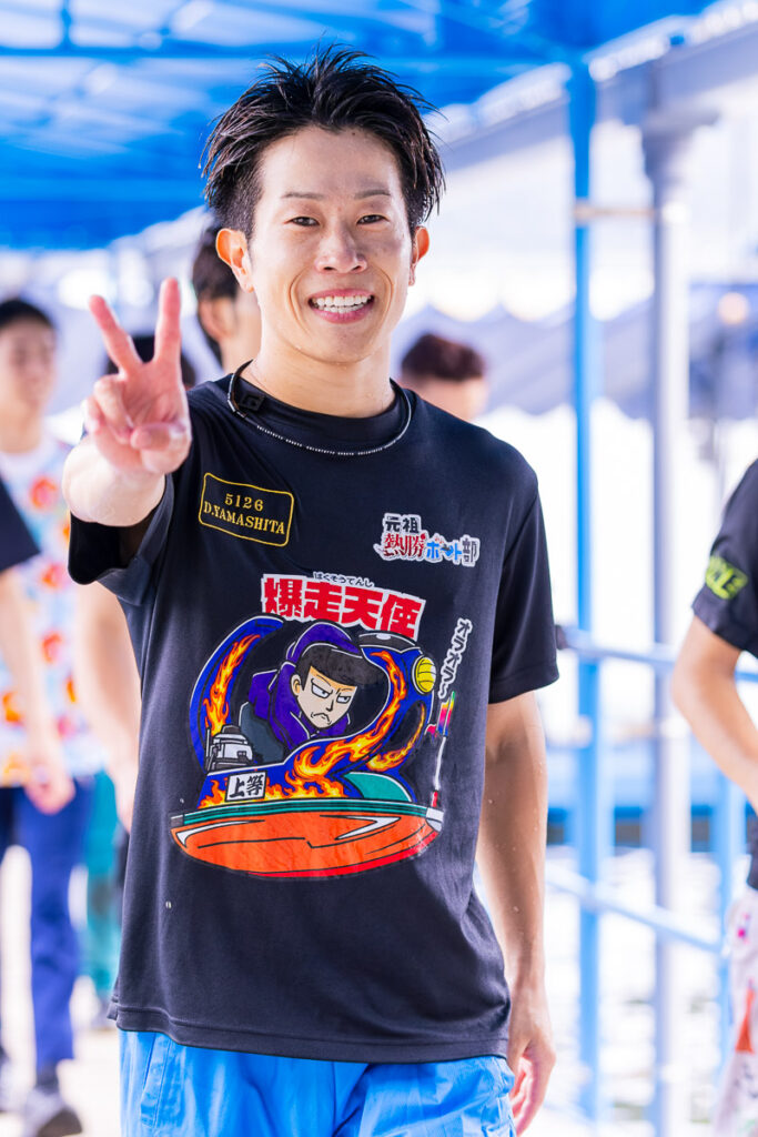 まず、8R発売中に山下の水神祭が行なわれた。初戦で妨害失格の憂き目にあいながら、上位の機力を武器にしっかり連に絡んできた今節。そんな奮闘を間近で見てきた仲間たちがテンションを上げて山下の初勝利を祝福した。ん? 同支部の宮田龍馬と登玉隼百も……。山下の1着の運をもらって準優に向かおうということだったと思われる。