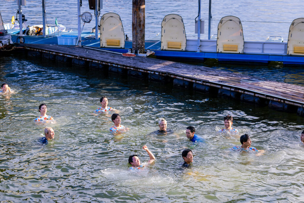 青木の水神祭はそれを上回る賑わい! 先に投げられた鰐部も参加するなど、総勢13人。それだけの人数が水面に飛び込んだので、主役の青木がどこにいるのか一瞬わからなくなるほどだった。みな楽しそうで何よりです!(笑)