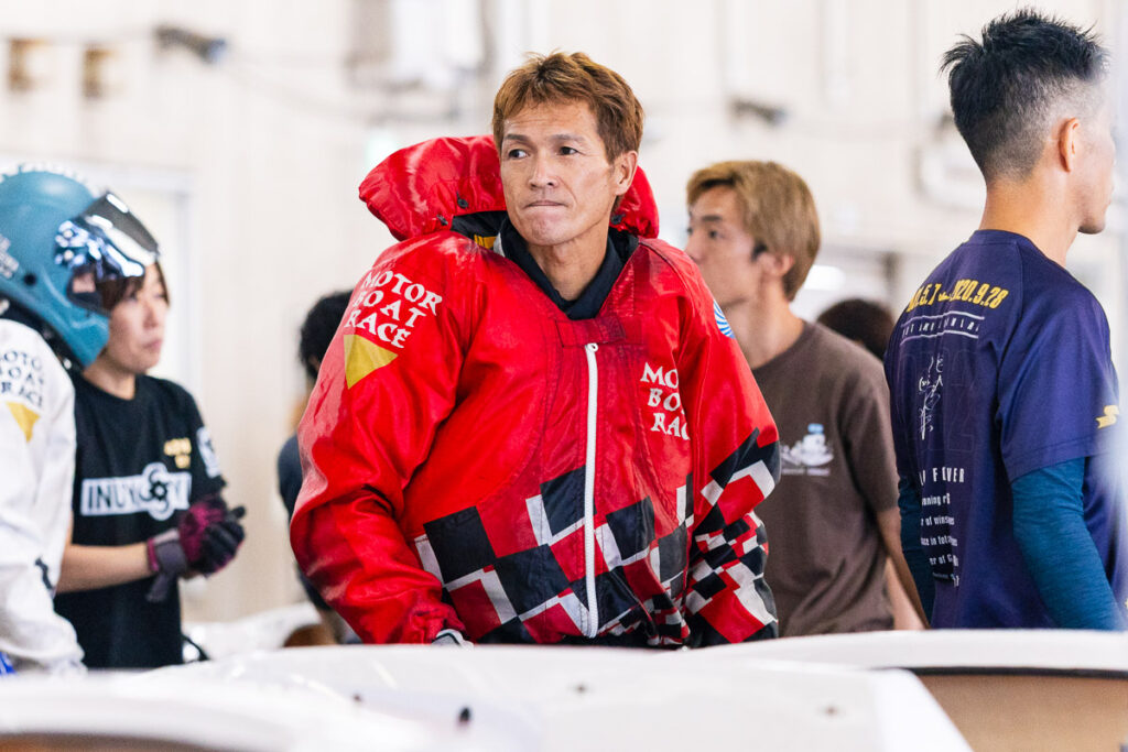 ただただ悔しそうに顔を歪め、装備を解いたあとはすぐにピットにあらわれて、地元の総大将である中島孝平に声を掛けている。装着場のモニターでリプレイを見ながら、アドバイスを乞うていたのだ。三国のイン戦のことを聞くなら、やはり中島孝平。今節、また1号艇があるかどうかはわからないのに、不本意に感じたことをすぐに解消しようとしたわけだ。この大会で選手と話していると、初日は「3着で良し」という言葉を聞くことはあったりする。しかし、それは本音ではないのだろう。勝ち上がりシステムがどうであろうと、水面に出れば勝利を渇望するのがボートレーサーだということだ。