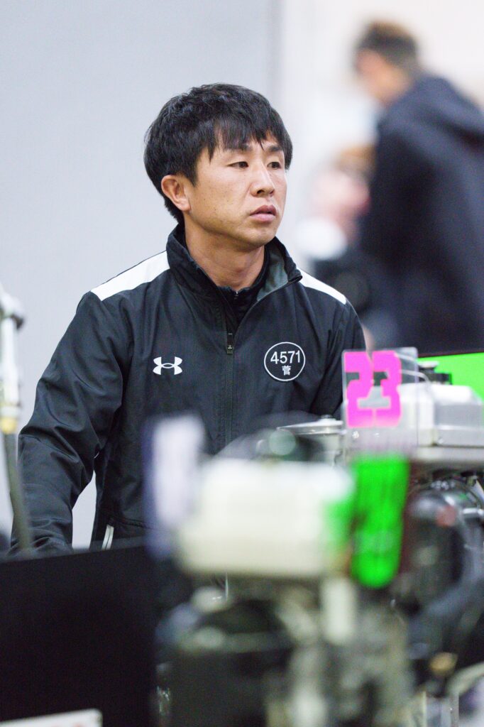 一方、前検航走を終えて少しテンションが下がっているように見えたのは峰竜太だ。69号機について、三島は「事故で若干の足落ち」という評価。たしかに2節前のエンスト後、成績は振るっていない。峰もそのあたりの気配を感じたのだろうか。その後、峰は整備室でかなり真剣な表情で整備士さんと話し込んでいる。本体整備の必要を感じ、その方向性を相談したものと思われる。明日は直前情報をぜひチェックしてほしい。