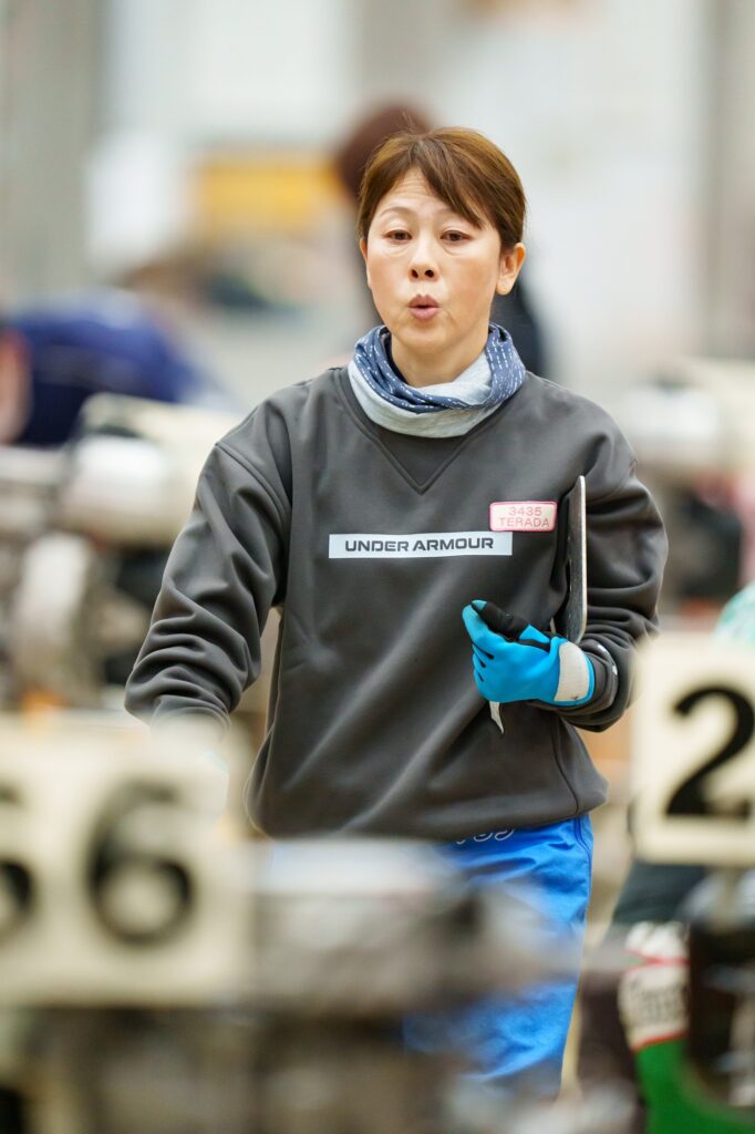 そうしたなかでも、ルーティンを崩すまいということなのか、航走検査後はさっそくペラ室に入って調整を始める選手が多々いたのだから頭が下がる。今日はそこまで感触を掴めなかっただろうから、まずは自分の形に叩いて明日に備えようということだろう。先述の寺田千恵もそのひとりで、疲れたと口では言いながら、仕事を辞める気配はなかったのだった。また、堀之内紀代子もさっそくペラ室入り。明日は1号艇と4号艇なのでチルトを跳ねる想定の調整ではないだろうが、“二刀流”が期待されるだけにそのための準備もあったものと思われる。