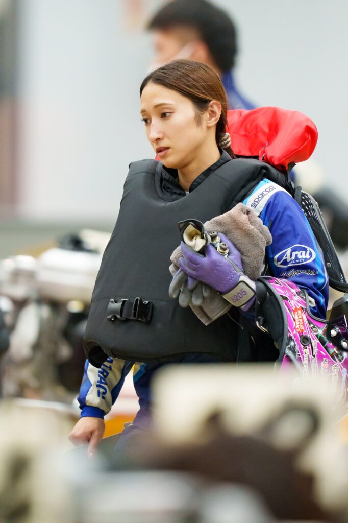 水面は大荒れで、これはこれでまた大変。航走検査からあがってきた選手たちは、思わず苦笑いしてしまうか、荒れ水面に顔をしかめるかの2パターン。寺田千恵は後者で、またこの大ベテランにしても航走検査のみというのは珍しいケースなだけに「もうヘトヘトよ……」と思わず愚痴をこぼすのだった。