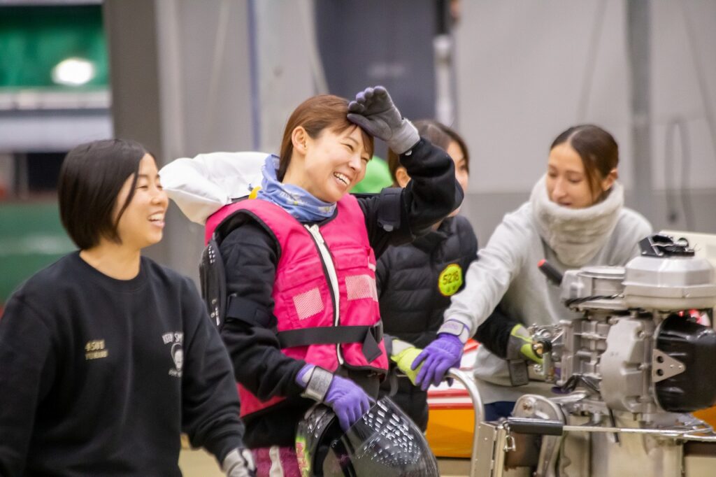 9R発売中に明日の11R組、10R発売中に明日の12R組のタイム計測とスタート特訓が行なわれている。いわゆる前検航走だ。引き上げてきた際の表情で、とにかく目立ったのが守屋美穂。とにかく明るく、笑顔満開なのだ。遠藤エミとの足合わせではやや劣勢だったそうで、決して抜群の手応えだったというわけではなさそう。それでも仲間と交わす笑顔はひたすらに輝いており、この舞台を戦える喜びにあふれているように見える。オープニングセレモニーでも珍しく優勝宣言をしていたように、決意をもって臨んでいるようにも見える今節。少なくともメンタルは早くも好仕上げのレベルと見えるのだがどうか。