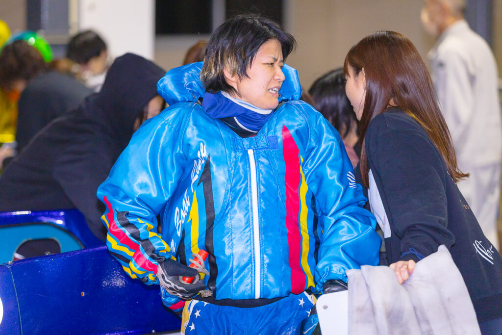準Vとはいっても、渡邉優美はまずせつなそうに眉をひそめた。ピット離れで遅れて6コースへ。おそらく頭に描いていたはずの戦略はすべて台無しになってしまったはずだ。あえて言うなら、悲願は遠のいた瞬間だったかもしれない。4カドから遠藤エミがまくっていったことで自身も握る展開になり、それが奏功して2番手争いにまでなったが、優勝戦は6コース2着で上出来ということはない。一瞬、泣き顔にも見えるほど、目元が哀愁を帯びていた。その後は、臨場していた選手会代表の瓜生正義(同支部の先輩でもある)にねぎらわれて笑顔を見せ、モーター返納作業では割り切ったように笑ってもいた。悲願を成就させるためにも、ここは前を向くしかない。