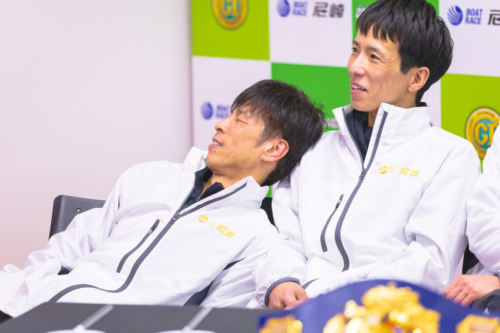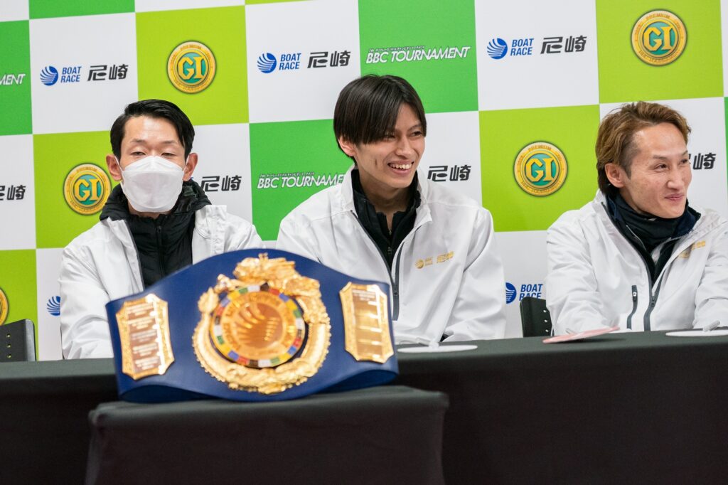 1号艇を手にしたのは、末永和也! 決勝戦のなかでダントツで若いヤングレーサーだけに、さすがに大げさに喜んだりはしなかったが、記者会見では「ツイてますね」とニッコリ。