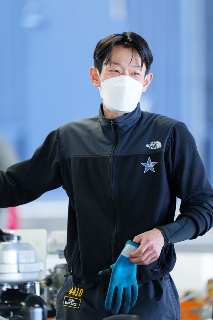 ガッツポーズを決めながらピットに戻って来た末永和也。出迎えた佐賀勢はみな笑顔で、なかでも特に嬉しそうなのは師匠の上野真之介。ただ、なにしろすでにSGウィナーの末永である。昨年のダービーでSGタイトルを手にしたときと比べると、やはり末永も佐賀陣営も冷静ではあった。それでも仲間のタイトル獲得はやはり嬉しいもの。なぜか峰竜太の姿はなかったが、その分、上野師匠が前面に出ての祝福となっている。