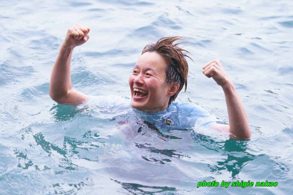 水神祭が行なわれたのは10R発売中。東京支部や関東地区をはじめとする選手仲間が大挙集合(実に14人!)、超賑やかな空気のなかで寺島を水面にドッボーンと投げ込んだ。寺島は、えっ、Tシャツ姿!? 今日は2月にしてはかなり暖かい気候だが、しかし半袖じゃ寒い! そして水も冷たい! それでも笑顔満開の寺島は、仲間たちの祝福に、また拍手する報道陣に、丁寧に頭を下げて回っていたのであった。人柄も素敵!