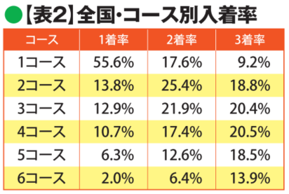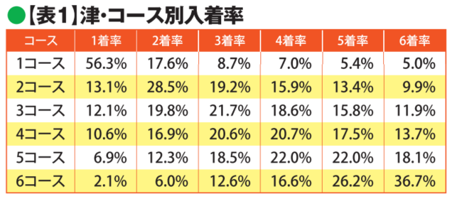 津のコース別成績は【表1】にまとめたとおり。1コース1着率56.3%は、全国平均【表2】よりも少しだけ高い数値だ。2~6コースの1着率も、全国平均の近似値に収まっている。バランスのとれた平均的なコースと考えていいだろう。