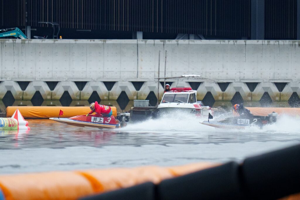 並びは枠なりだが、3号艇の井上が決然とカドに引いた。前日の記者会見では3コーススローを宣言していた井上だったが、自慢の伸び足を活かすために秘策を繰り出したのだ。これが奏功した……かに見えた。3コースから一気に内を叩いていった井上は、2コースの中山翔太にやや抵抗されながらも、1マークでは完全にまくり切った。見事な3カドまくり炸裂である。YouTube「展望BOATBoy」で井上の3コースまくりを本命にしていた畠山シュー長はその瞬間に全身の毛穴を大開放していたとかいなかったとか。