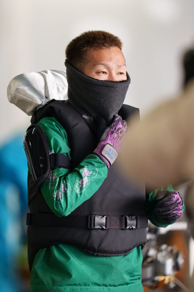 我々は、まだ防寒着を着用しているからマシだけど、選手はそういうわけにはいかない。もちろんある程度は防寒対策をしているけれども、ボートに乗る関係上、我々よりは薄着にならざるをえない。また、たとえばプロペラを装着したり外したりするとき、どうしても素手でペラやナット類などの金属に触れなければならないのだ。想像しただけでも冷たい! 陸の上でやるならまだしも、係留所にボートをつけた状態でこれをするとき、特に外すときなどは水に冷やされた金属を触るのである。冷たすぎ!