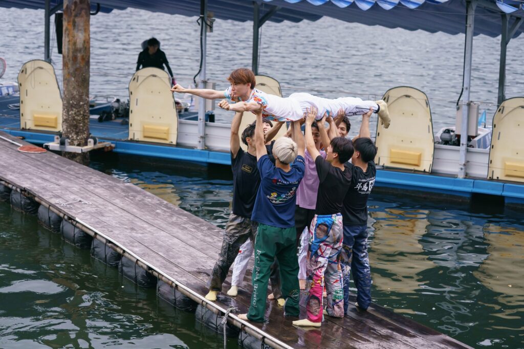 つづいて高井。参加したのは愛知勢を中心に同期勢などだが、陸に上がったばかりの登玉もちゃっかり紛れ込んでいた。高井はオーソドックスな「ウルトラマンスタイル」で投げ込まれたが、持ち上げられた際に手足をピンと伸ばして、うーん、スマート! 豪快に投げ込まれた後、仲間たちも次々と飛び込み、登玉もちゃっかり飛び込んでました。