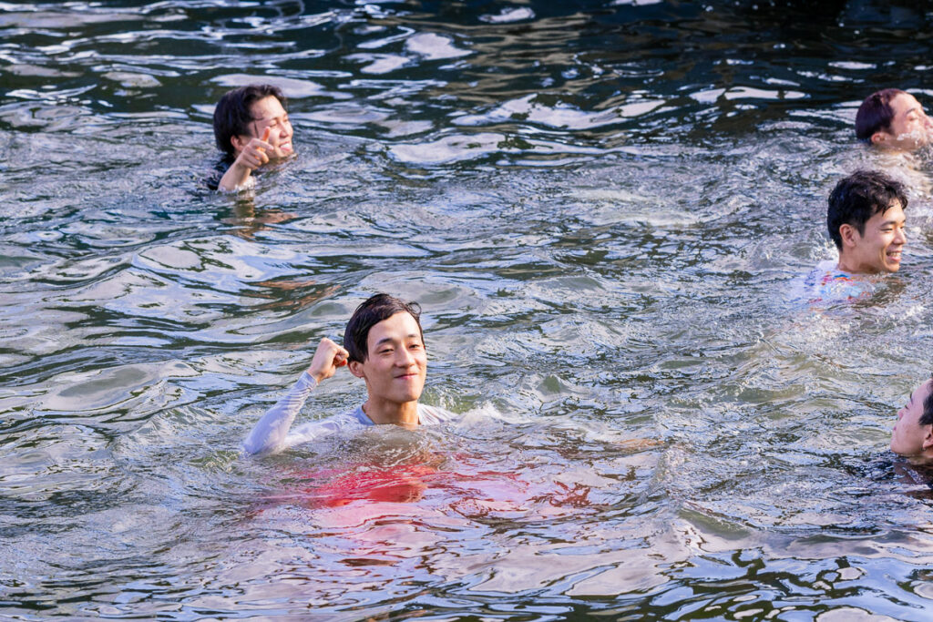 水神祭は11R発売中。埼玉勢や126期の同期、そしてなぜか末永和也、前原大道、中亮太も参加。中野を水面に放り投げたあとは、多くの選手も一緒に飛び込んで、中野とともに水中でバンザイだ。そして、末永と前原と中は上着を脱いで上半身裸になると、背中を見せて整列! すると「水」「神」「祭」と大書されていた……そういうことでしたか! ちなみに水=末永、神=中、祭=前原でした。