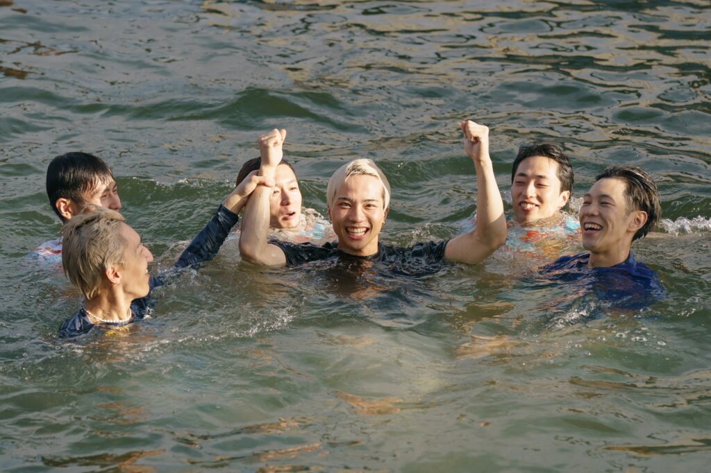 青木の水神祭はそれを上回る賑わい! 先に投げられた鰐部も参加するなど、総勢13人。それだけの人数が水面に飛び込んだので、主役の青木がどこにいるのか一瞬わからなくなるほどだった。みな楽しそうで何よりです!(笑)