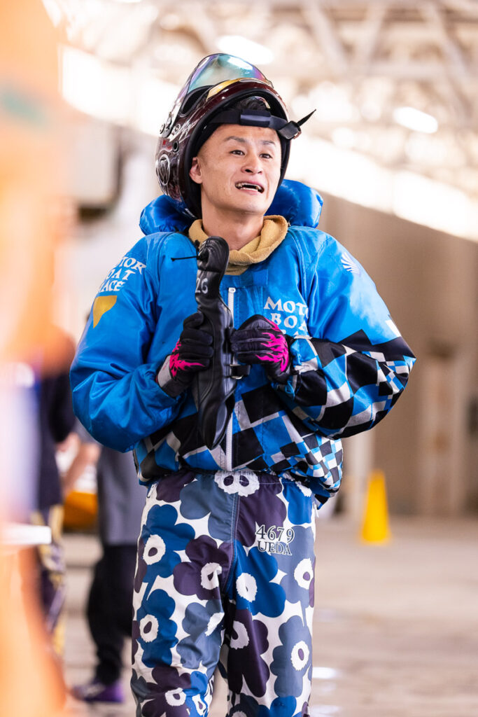ただただ悔しそうに顔を歪め、装備を解いたあとはすぐにピットにあらわれて、地元の総大将である中島孝平に声を掛けている。装着場のモニターでリプレイを見ながら、アドバイスを乞うていたのだ。三国のイン戦のことを聞くなら、やはり中島孝平。今節、また1号艇があるかどうかはわからないのに、不本意に感じたことをすぐに解消しようとしたわけだ。この大会で選手と話していると、初日は「3着で良し」という言葉を聞くことはあったりする。しかし、それは本音ではないのだろう。勝ち上がりシステムがどうであろうと、水面に出れば勝利を渇望するのがボートレーサーだということだ。