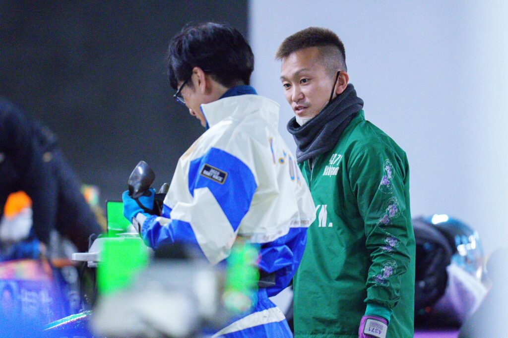 一方、前検航走を終えて少しテンションが下がっているように見えたのは峰竜太だ。69号機について、三島は「事故で若干の足落ち」という評価。たしかに2節前のエンスト後、成績は振るっていない。峰もそのあたりの気配を感じたのだろうか。その後、峰は整備室でかなり真剣な表情で整備士さんと話し込んでいる。本体整備の必要を感じ、その方向性を相談したものと思われる。明日は直前情報をぜひチェックしてほしい。